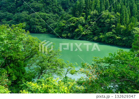 大自然に包まれた田沢湖の鳥居と静かな湖面