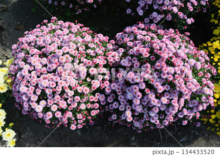 Dense mound of Jiji Pink chrysanthemums blooming in soft light with countless pastel pink flowers forming a lush rounded shape in a vibrant garden setting.