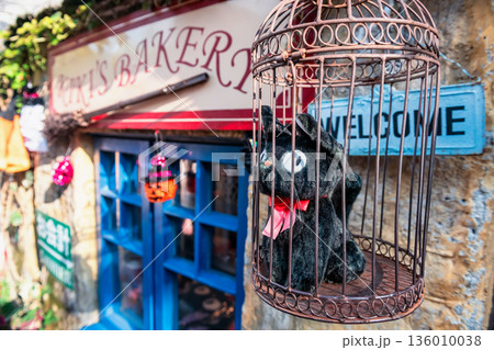 Jiji cat dolls of Kiki Delivery Service in cage at Yufuin floral village