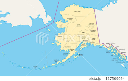 Alaska, U.S. state, subdivided into 19 organized boroughs and 11 census areas, multi colored political map. State on the northwest extremity of North America in the Western USA region. Last Frontier.