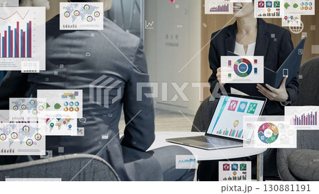 オフィスでミーティングする多国籍の人々とビジネスデータ