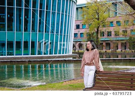 新入生を待つ春爛漫の高知県立 高知工科大学 食堂三角ガラス窓