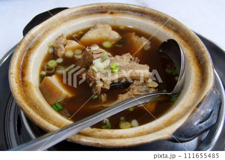 Steaming bak kut teh served with rice in clay pot: authentic malaysian cuisine