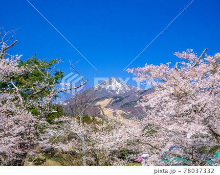 雪の残る磐梯山と雪の解けたスキー場を桜の咲く公園から眺める (亀ヶ城公園、猪苗代、福島)