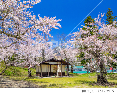 公園の満開の桜並木と趣ある公衆トイレ (亀ヶ城公園、猪苗代、福島)