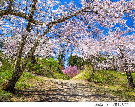 満開の桜に囲まれた公園の遊歩道 (亀ヶ城公園、猪苗代、福島)