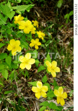 晩春の木漏日を背景に山道に咲く一重ヤマブキの黄色い花 Ver1