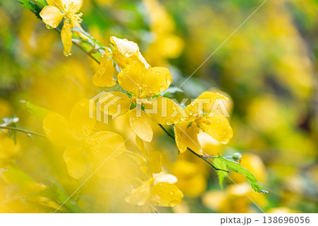 春のヤマブキの花が連なる風景・柔らかな背景素材