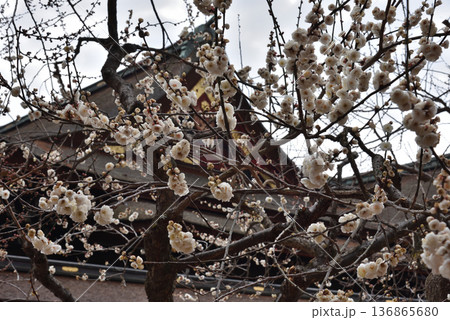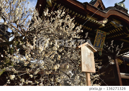 早春の北野天満宮 白梅とご本殿(京都市上京区)