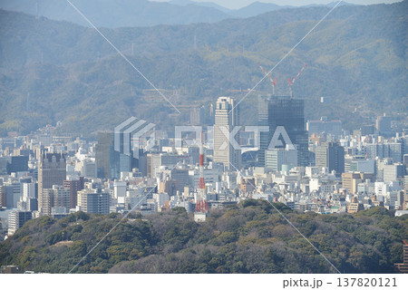 双葉山山頂から広島駅北口から東方面への展望です。ザ・広島タワーや黄金山が見えます。明るい背景です。