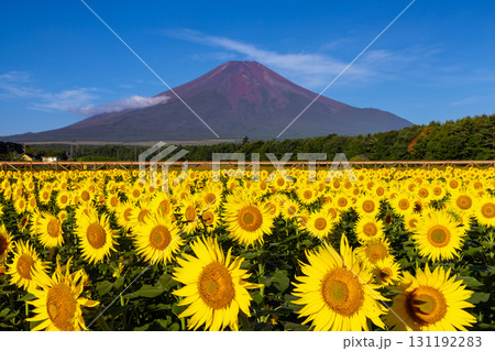 山梨県南都留郡山中湖村山中 花の都公園の満開のひまわり畑と青空の富士山