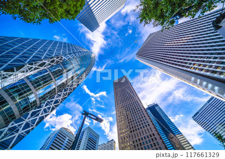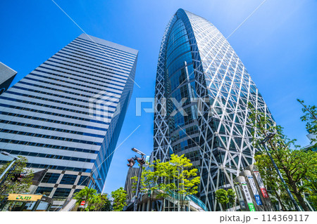日本の東京都市景観 8月。東京モード学園コクーンタワーや損保ジャパン日本興亜本社ビルなどを望む