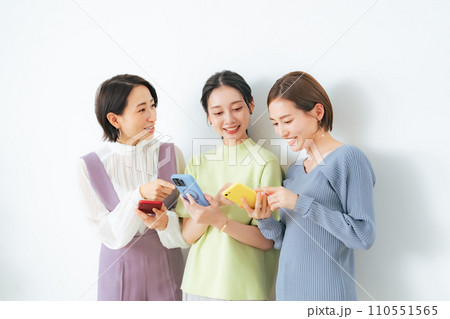 スマホを見ながら会話するミドル女性グループ