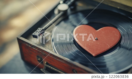 Vinyl record with a heart symbol design on a wooden background for music lovers