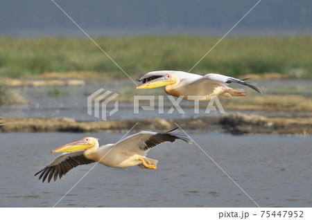 モモイロペリカンの飛翔(ケニア)