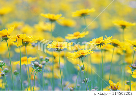 Coreopsis is a genus of flowering plants in the Asteraceae family. Common names include calliopsis and tickseed, a name shared with various other flowers. Concept of a summer meadow full of blooming