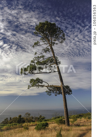 Wild pine tree with flag crown against the backdrop of sea water and sky.