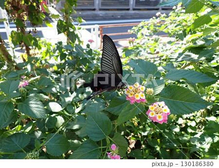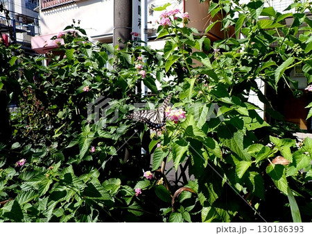 秋の公園に咲くカラフルなランタナの花の周りを飛ぶキアゲハ蝶