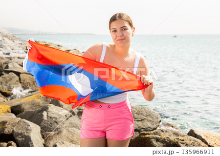 Young woman on coast posing with flag of Laos