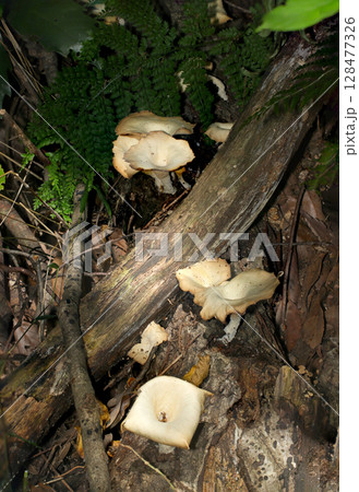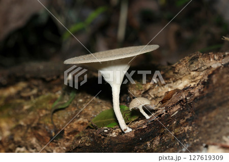 夏の木洩れ日のもと大きな漏斗状灰茶色のネッタイカワキタケキノコ(自然環境下菌界マクロ撮影)