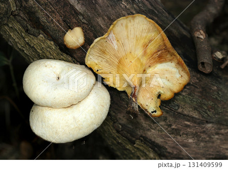 切り株に自生する大きなマツオウジ属と思われるキノコ(自然光マクロ接写)