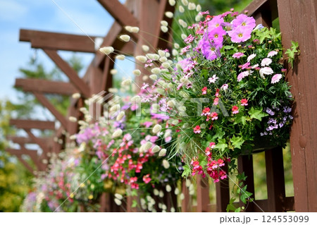木製フェンスに飾られた春のハンギングバスケット