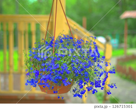 Small blue lobelia flowers hanging in a pot on the porch of a house