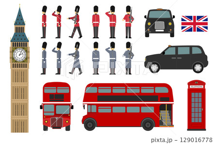 ロンドンの旅と英国雑貨の線画イラストセット(透過PNG)