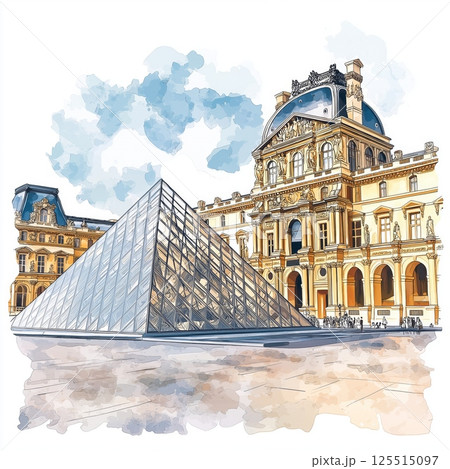 Louvre Museum. Louvre Museum hand drawn watercolor illustration