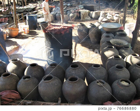 ラオス、ルアンパバーン(ルアンプラバーン)のバーンサーンハイ(酒造りの村)で焼酎のラオ・ラーオの製造