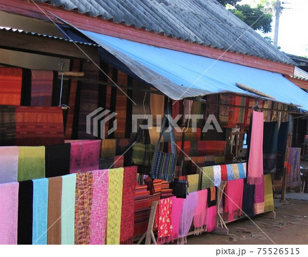 ラオス、ルアンパバーン(ルアンプラバーン)のバーンサーンハイ(酒造りの村)の織物店。