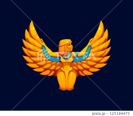 Ancient golden winged goddess, Isis or Maat. Egypt game icon, Egyptian treasure asset. Cartoon vector sacred symbol for mythology, adventure, or archaeology games, exudes mystery and divination