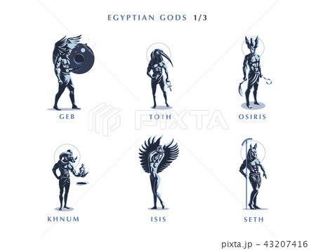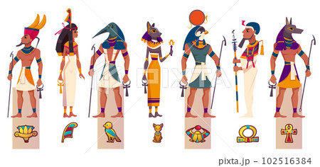 Set of ancient Egyptian gods and goddesses with religious symbols