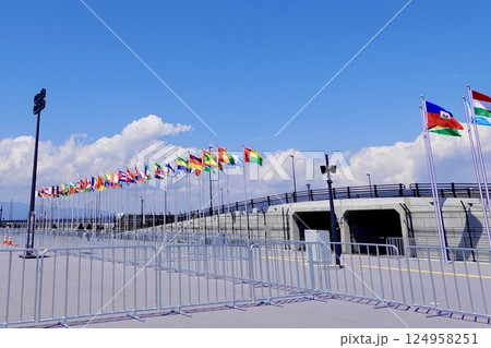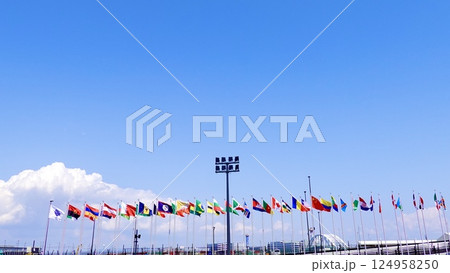 EXPO2025 大阪・関西万博 東ゲート付近に並ぶ万国旗がはためく風景 大阪市此花区夢洲