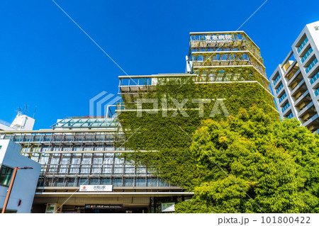 日本の東京都市景観 夏日。東急病院併設の東急電鉄 大岡山駅・駅舎などを望む