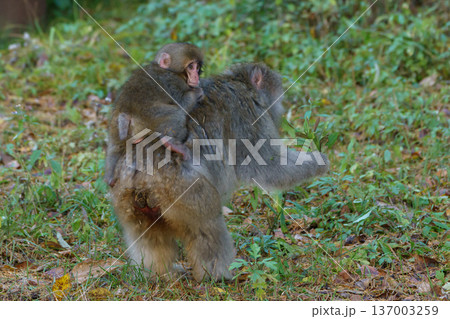 地獄谷温泉 子猿をおんぶして歩くニホンザル