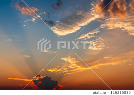 夏 夕焼けの光芒 山に沈む夕日 空のみ