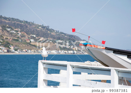 ロサンゼルスのサンタモニカから車で約30分の所にあるマリブピア。桟橋の辺りに立つ海鳥と海の景色。