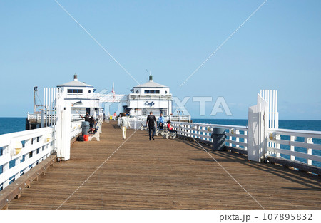 カリフォルニア州ロサンゼルスのサーフライダービーチ近くにあるマリブピア(通行人は後ろ姿か顔ぼかし)