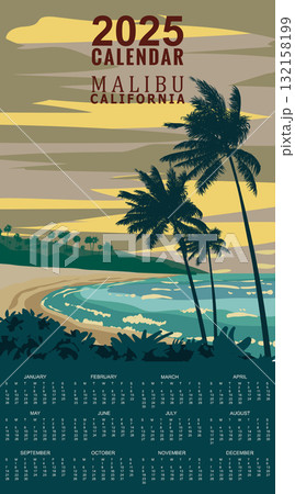 Calendar Monthly 2025 California Malibu Beach retro travel poster vector