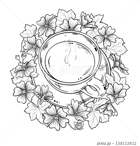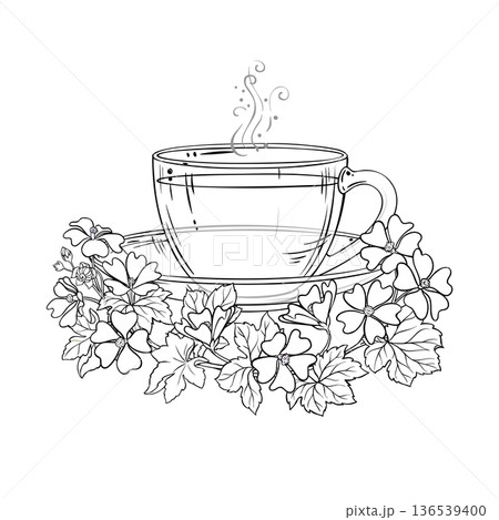 Malva Plant with Flowers and Leaves Outline Illustration.