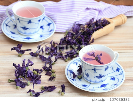Two cups of herbal tea from dried flowers of Wild mallow, lat. Malva sylvestris.