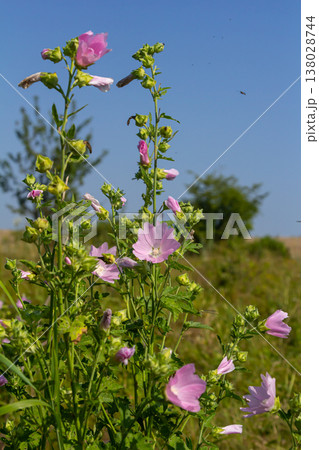 Blooming pink mallow flowers (Malva alcea, cut-leaved mallow, vervain mallow or hollyhock mallow) in summer garden.