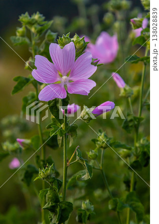 Pink common mallow. Latin name Malva L. Flowers shine under the rays of the sun.
