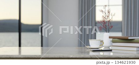 Coffee cup aside books and flower vase on marble counter in living room or cafe with scenery outside