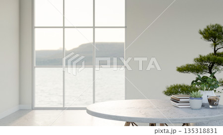 White frame glass window and white wall with houseplant in pot on marble floor in a sea view room.