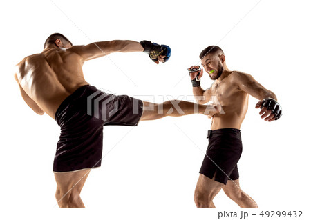 Two professional MMA fighters boxing isolated on white studio background, dynamic and motion. Top view