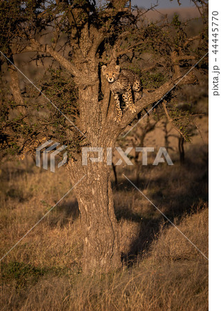 Cheetah cub stands in tree looking down