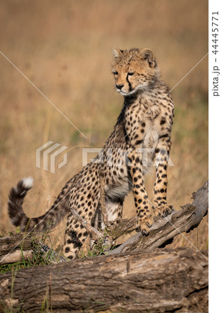 Cheetah cub standing on log looking round