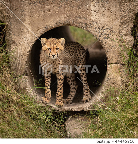 Cheetah cub stands in pipe and stares